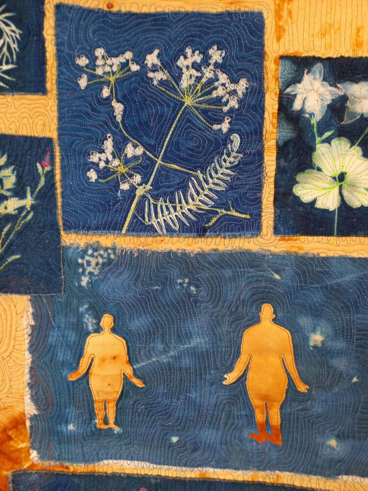 Tanja van Zijtveld (Emmen) maakt prachtige textielkunst. Ze combineert daarbij allerlei technieken en materialen. Zo werkt ze soms ook met ‘cyanotype’, een 19e eeuwse fotografische techniek die een blauwe afdruk produceert. Al jong was ze bezig met textiel. Dat was toen ‘nuttige handwerken’, want ja, je moest er wel wat aan hebben. In 1995 ontdekte ze het quilten en leerde hier alles over. Daarna kreeg art quilten haar belangstelling: het werken met andere materialen en vormen. Ze leerde om stoffen te kleuren met verfstoffen uit planten. Nu neemt ze alle vrijheid bij het ontwerpen en maken van haar textielkunst en, aangesloten bij textielgroepen, ontwikkelt ze zich verder.