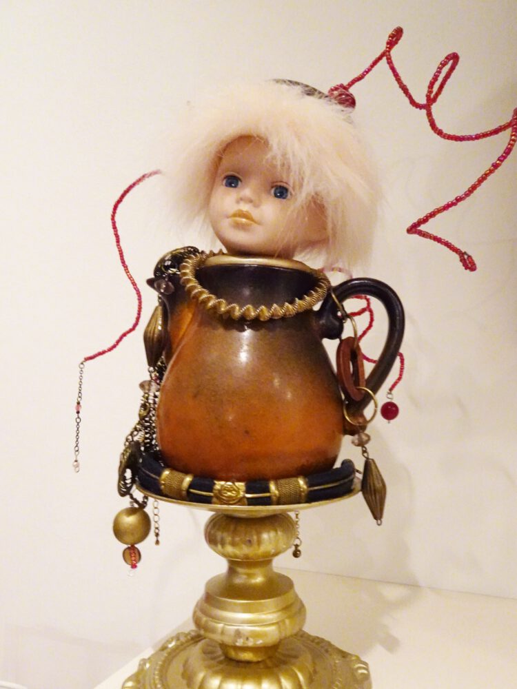 Jannie Boezeman is zilversmid in Barger-Oosterveld. Ze combineert het bewerkte zilver met halfedelsteen, kraaltjes, knoopjes en oude bedeltjes tot vrolijke creaties. Dat kunnen sieraden zijn, zoals kettingen en ringen, maar ook ruimtelijke objecten die mooi zijn om neer te zetten. Zo ook deze serie ‘poppen met sier’, samengesteld uit allerlei vormen en kleuren. Zo passend, dat de poppen zowaar een karakter hebben gekregen.
